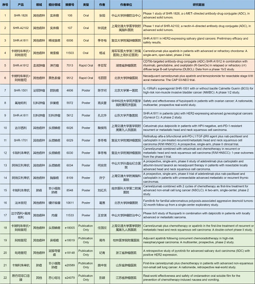 在肺癌、妇科肿瘤、淋巴瘤、膀胱癌、头颈肿瘤、黑色素瘤、肉瘤、鼻咽癌、脊索瘤、唾液腺癌、胸腺癌、硬纤维瘤、涎腺导管癌等其他多个疾病领域,卡瑞利珠单抗、阿帕替尼、阿得贝利单抗、吡咯替尼、达尔西利、氟唑帕利、法米替尼、SHR-1501、瑞拉芙普-α(SHR-1701)、SHR-1826、瑞康曲妥珠单抗(SHR-A1811)、SHR-A1912、SHR-A2102等抗肿瘤创新药相关研究一共入选了4项口头报告、2项快速口头报告、11项壁报展示和4项线上发表,彰显了永利娱乐城医药强劲的研发实力。此外,昂丹司琼口溶膜在防治化疗导致的恶心呕吐方面展现出了良好的疗效,本次ASCO年会有1项研究线上发表。